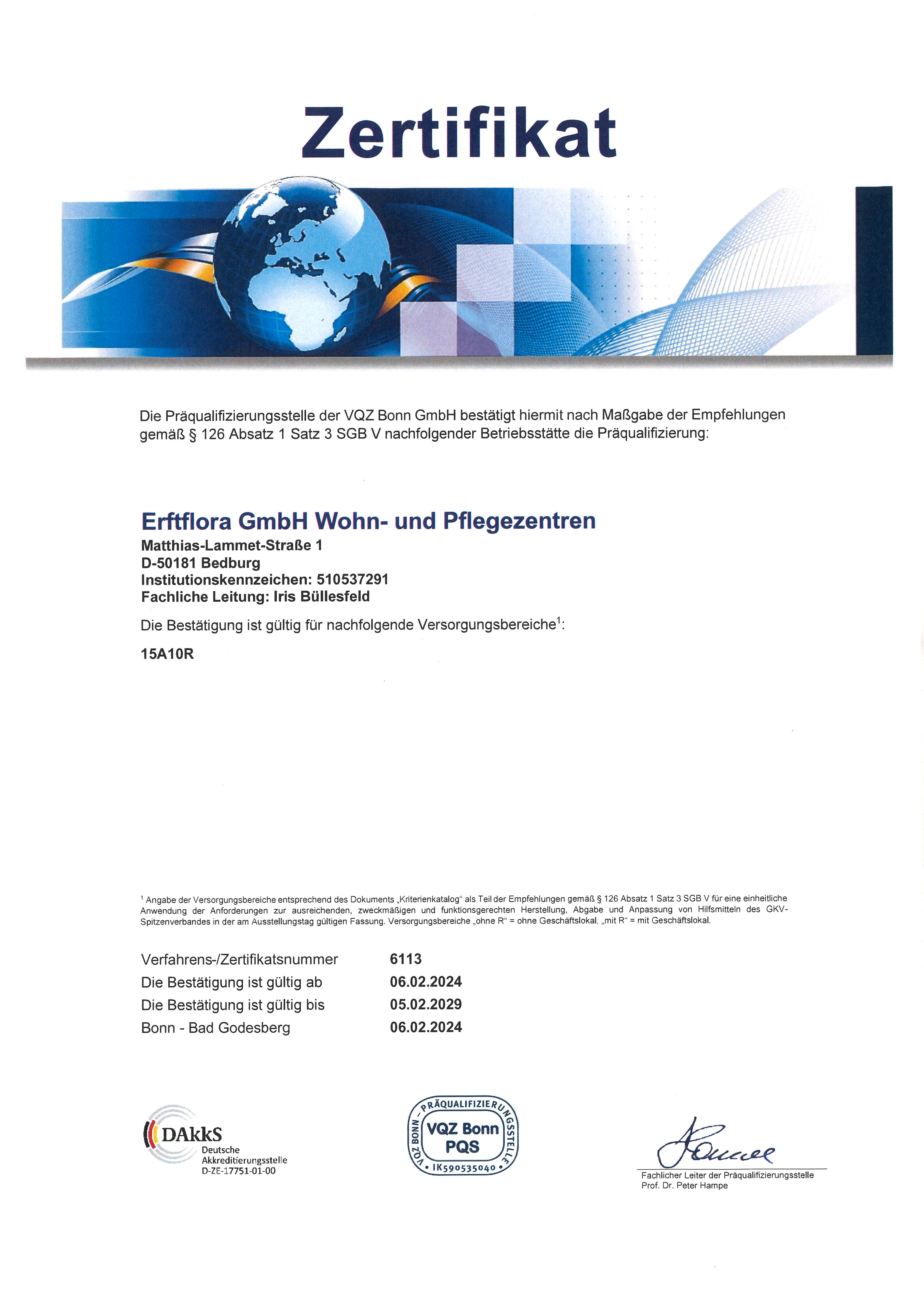 Durch seine intensive Arbeit hat unser Inkontinenzbeauftragter Herr Sven Hamacher dafür gesorgt, dass die Erftflora GmbH bis zum 05.02.2029 die Auflagen der Präqualifizierungsstelle für Inkontinenzartikel erfüllt.